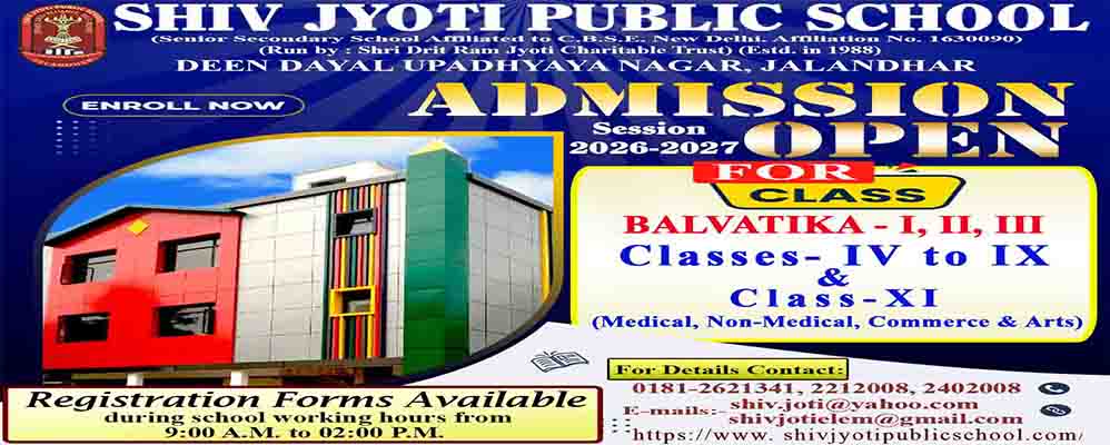 SHIV JYOTI PUBLIC SCHOOL, Jalandhar is a CO-Educational, non-residential and non-aided institution established in 1988.The institution has been affiliated to the Central Board of the Senior Secondary Education, New Delhi since 1994.it has been upgraded to the Senior Secondary Level since 2002.It is being run by Shiri Dhrit Ram Jyoti  Charitable Trust, a duly registered body. Making a modest beginning of the school in April, 1988 with 40 students, the School has been growing incessantly  and now it has approximately 2300 students under the wings from classes I to XII. The number of teachers has risen upto 80.
